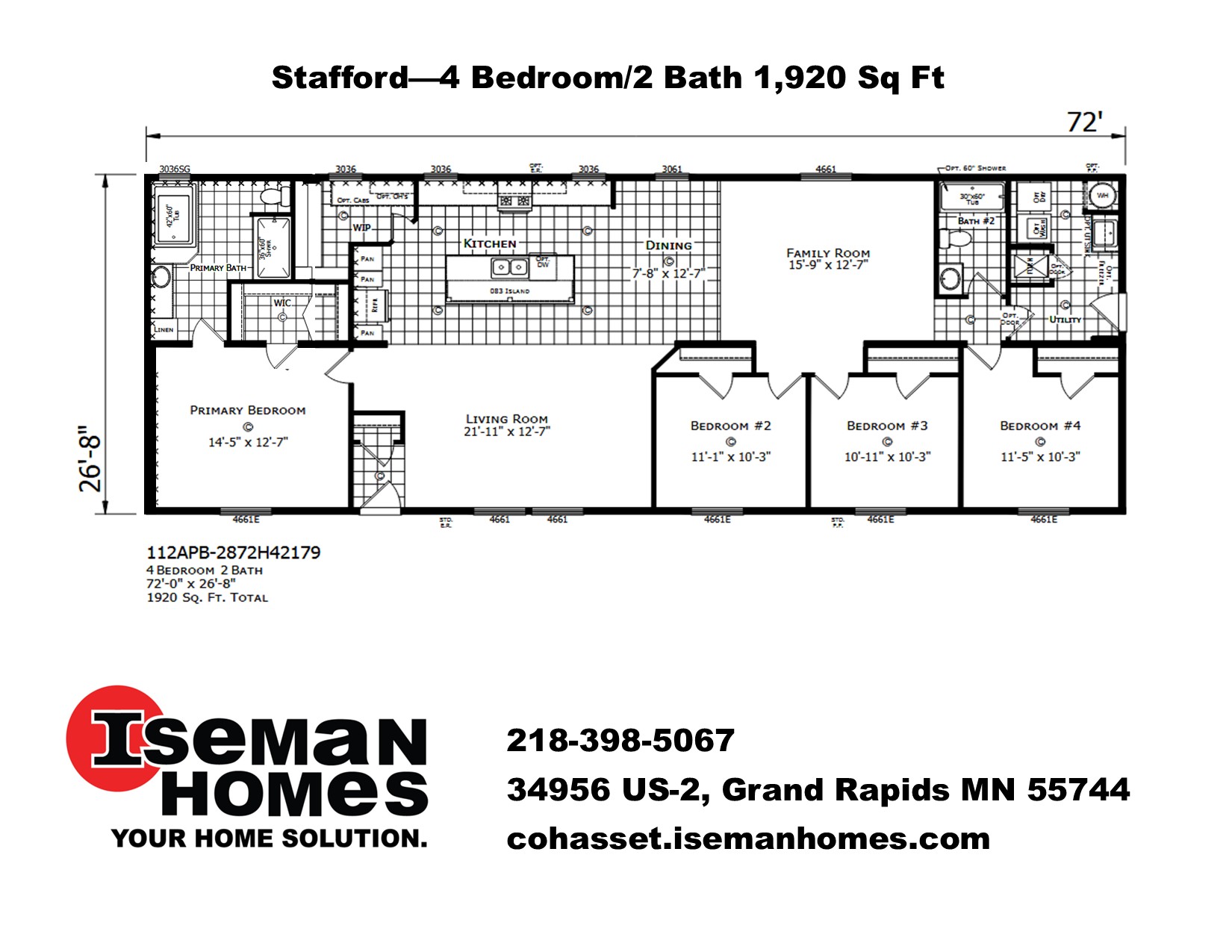 Now available to order in Cohasset, MN — The Stafford offers spacious, well-appointed living with 4 bedrooms, 2 bathrooms, and over 1,900 sq ft of open-concept design. The kitchen serves as the heart of the home, featuring a striking island, black appliances, warm wood cabinetry, and a discreet walk-in pantry. Two distinct living areas provide flexibility for work, relaxation, or entertaining. With abundant natural light and integrated storage throughout, this home is fully equipped to welcome your family with ease. For more details, contact us at 218-398-5067. Ask our sales team about available financing options.