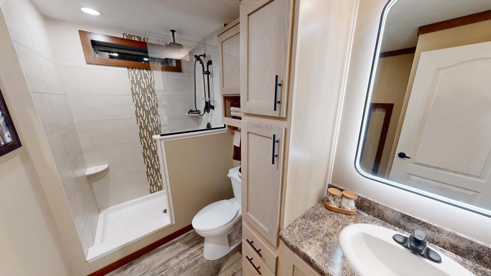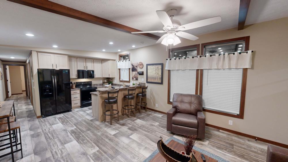 Featuring a striking green exterior and a rustic interior, The Lakeside offers a cozy vacation cabin vibe with elevated comfort. Highlights include a covered porch for sunset relaxing, an electric fireplace for cold days, and a rainfall walk-in shower. Durable LP siding ensures this home is built to last in any weather! Call us at 605-336-3276 for more information on this home!