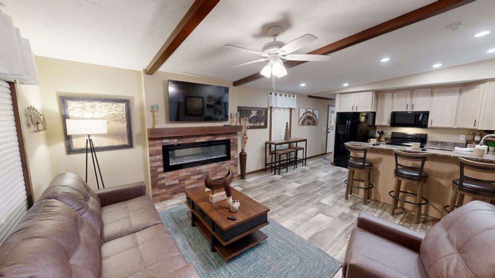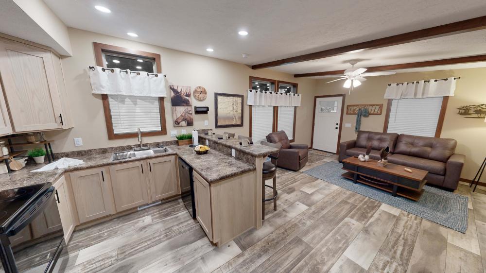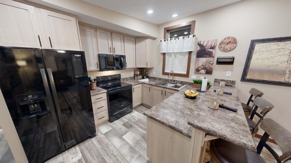 Featuring a striking green exterior and a rustic interior, The Lakeside offers a cozy vacation cabin vibe with elevated comfort. Highlights include a covered porch for sunset relaxing, an electric fireplace for cold days, and a rainfall walk-in shower. Durable LP siding ensures this home is built to last in any weather! Call us at 308-237-3843 for more information on this home!